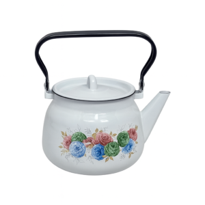 Emaljēta tējkanna 2,5 L, sfēriskā forma, ar plastmasas rokturi un zīmējumu